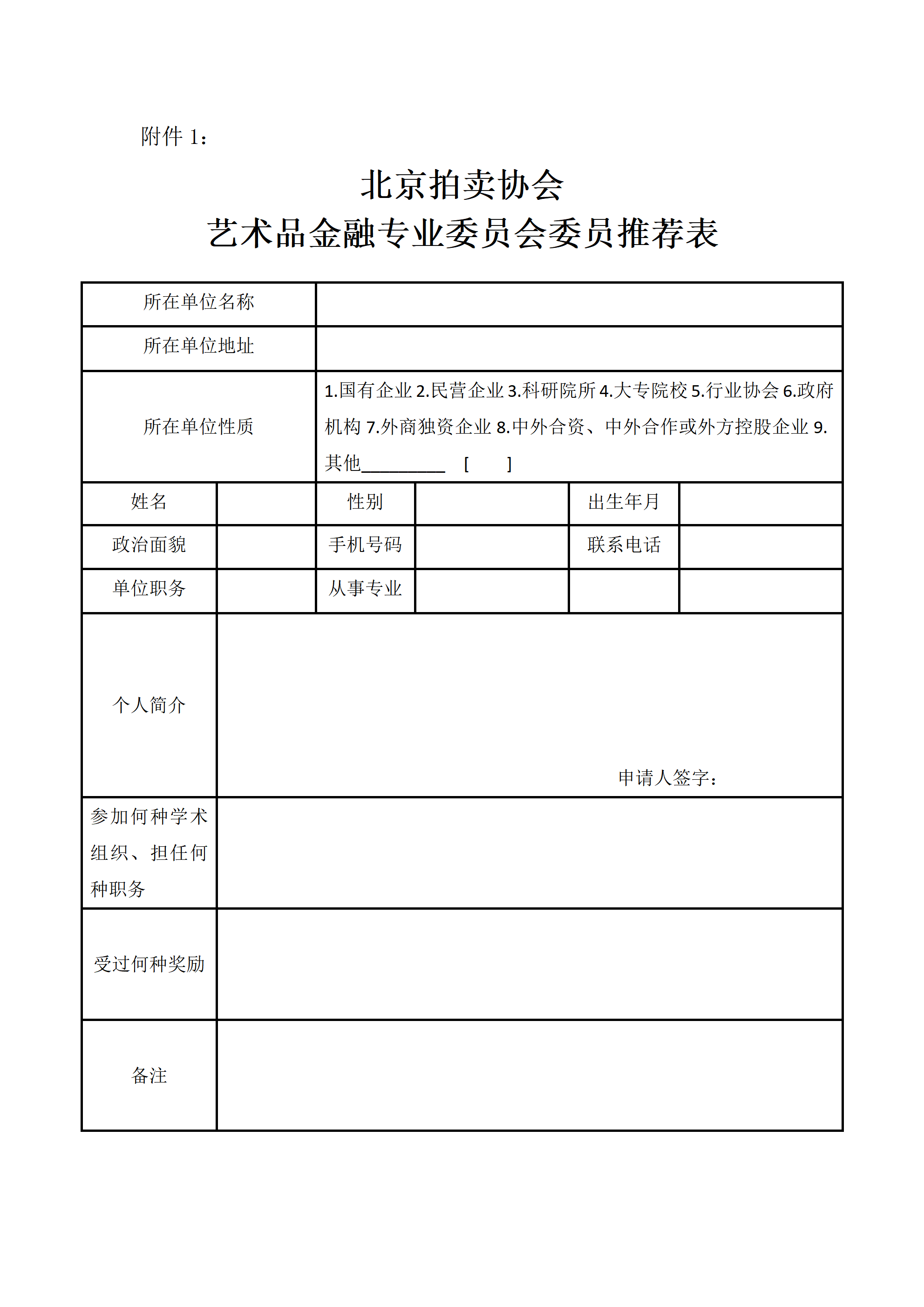 北京拍賣(mài)協(xié)會(huì)藝術(shù)品金融專業(yè)委員會(huì)委員推薦表