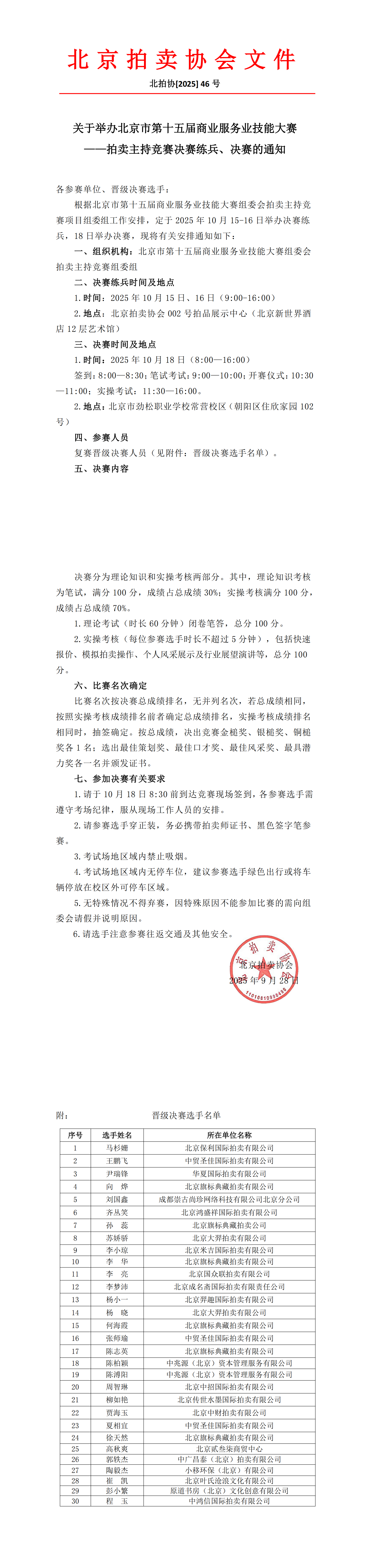 關于舉辦北京市第十五屆商業服務業技能大賽拍賣主持競賽項目決賽的通知