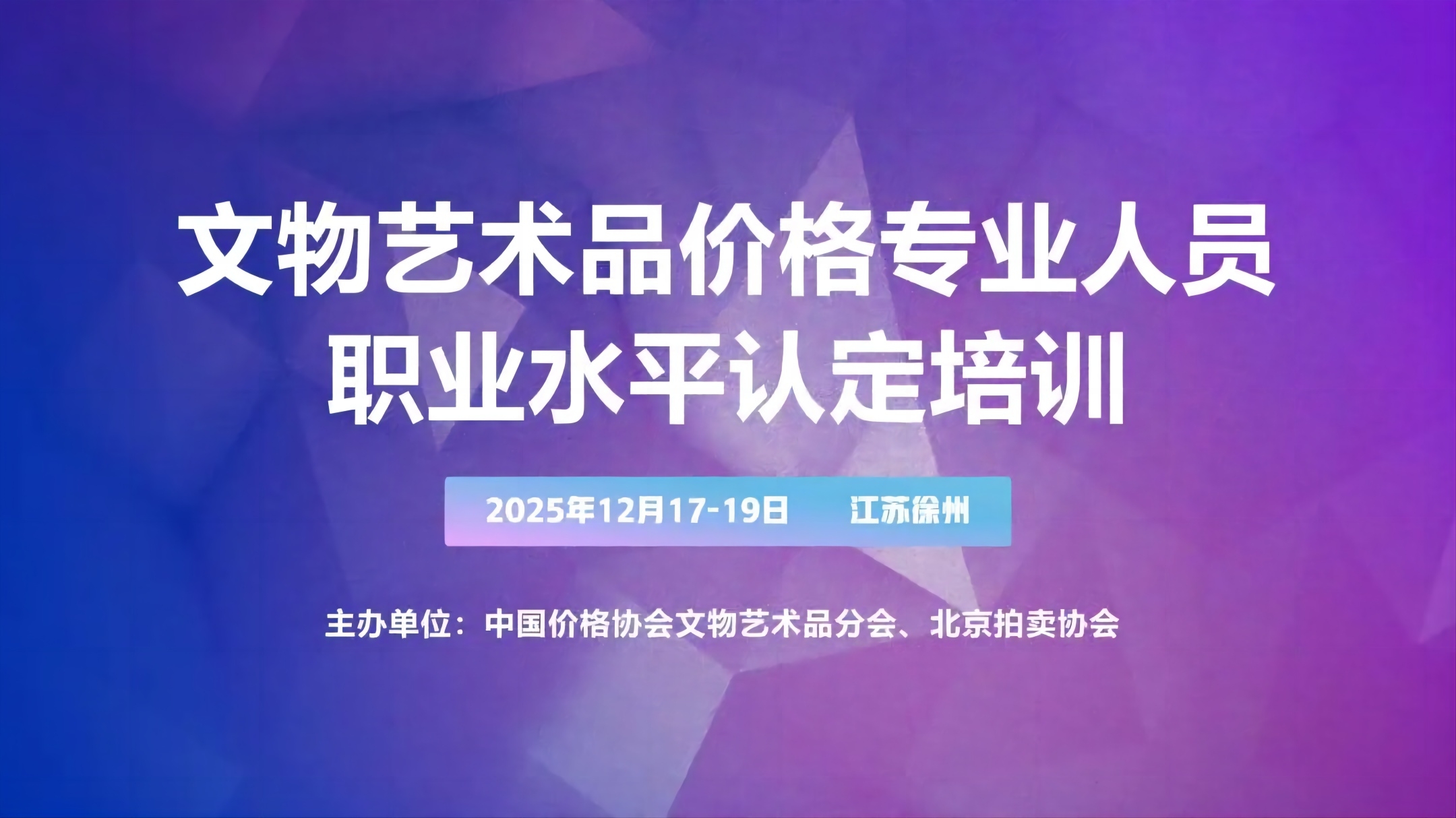由北京拍賣協會與中國價格協會文物藝術品分會聯合舉辦的文物藝術品價格專業人員職業水平認定培訓、認證工作,將于2025 年 12 月 17-19 日在江蘇徐州開展。完成培訓并通過考試、考核者,將獲得“文物藝術品價格專業人員證書”。