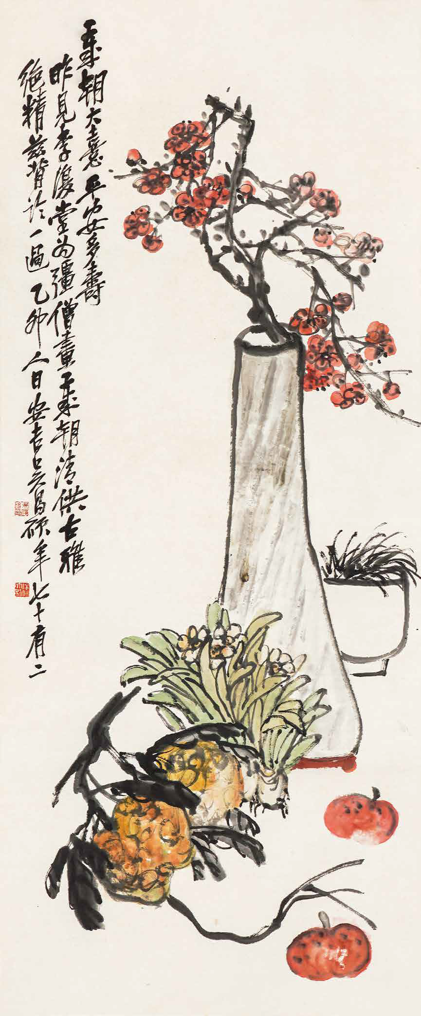 【款識】歲朝大喜,平安多壽。昨見李復堂為強僧畫歲朝清供,古雅絕精,茲背臨一遍。乙卯人日,安吉吳昌