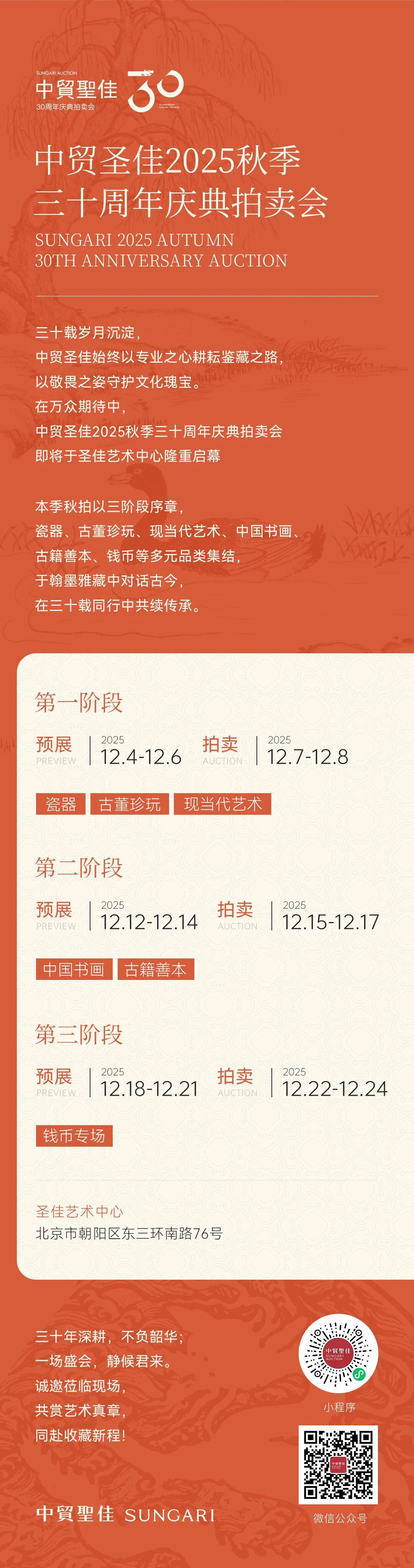 第二階段中國書畫、古籍善本,春雷琴室擷珍,第三階段錢幣專場的重磅藏品將陸續登場。更多收藏驚喜,敬請持續關注中貿圣佳官方平臺,與我們一同深耕鑒藏之旅,共赴三十周年的文化之約。