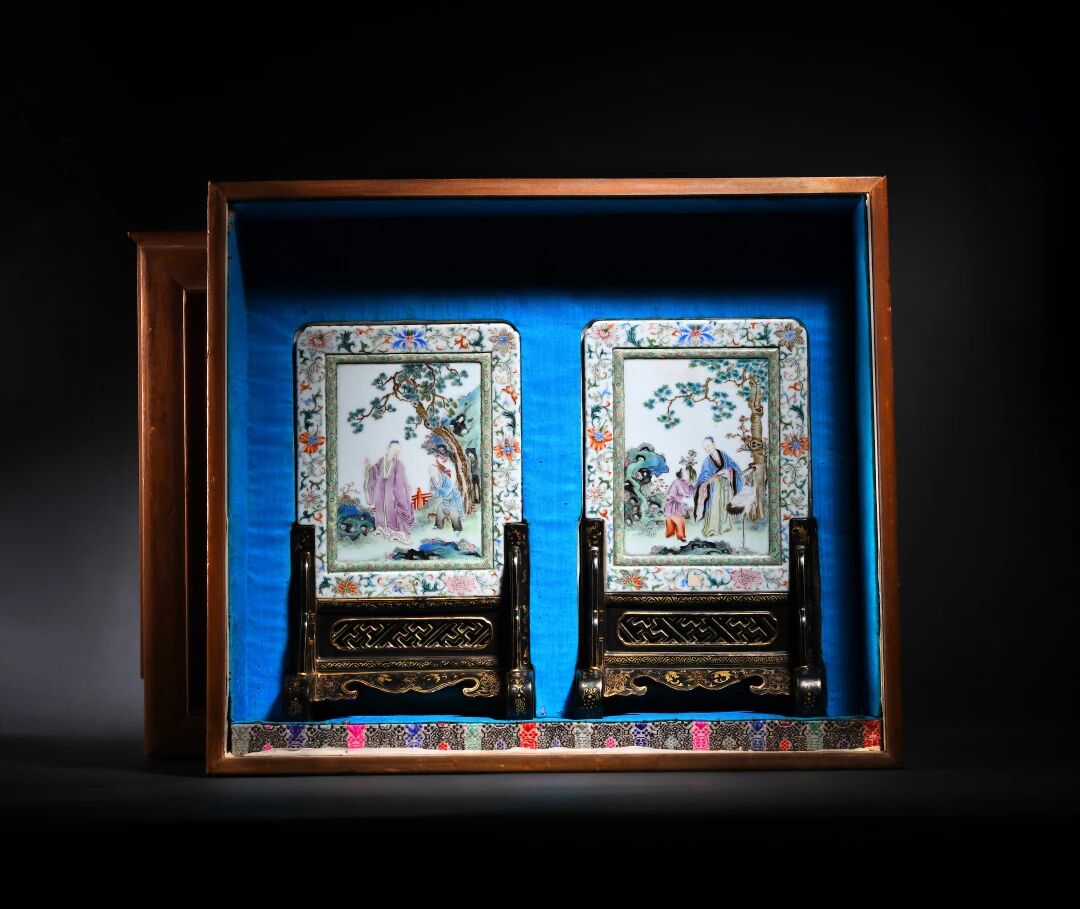清乾隆 御制洋彩山水高士圖硯屏一對