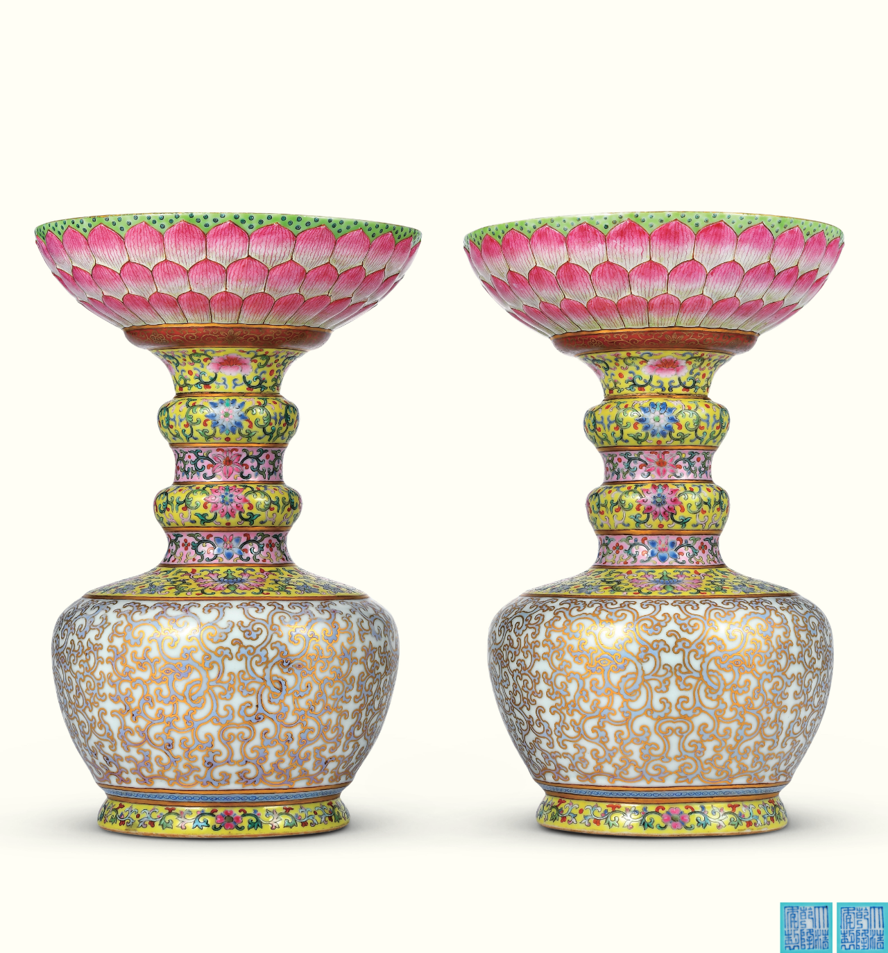 清乾隆 洋彩黃地西番蓮描金螭龍紋蓮花盤口尊一對