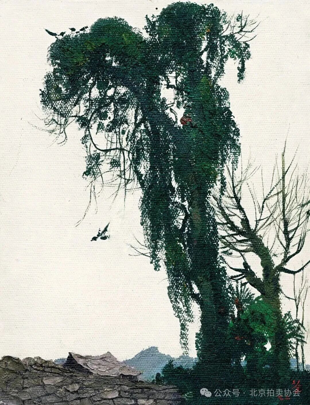 說明:此件拍品為張仃舊藏。一九七二年,張仃與吳冠中同在河北獲鹿縣小壁村部隊農場勞動改造。一九八四年春節,張仃從中央工藝美院院長職務離休。吳冠中挑出這幅名為《喜鵲》的小油畫相贈,是以紀念二人共同有過的特殊歲月。畫中低矮的石板屋和石頭墻,是太行山下民房的特色,暮色中老樹的剪影有些蒼涼,好在有三只喜鵲嘰嘰喳喳的喧鬧,才使這血色的寧靜中有了些許生氣。一幅寫生小稿,但在歷史語境中解讀,竟也有了象征的意味。(王魯湘)