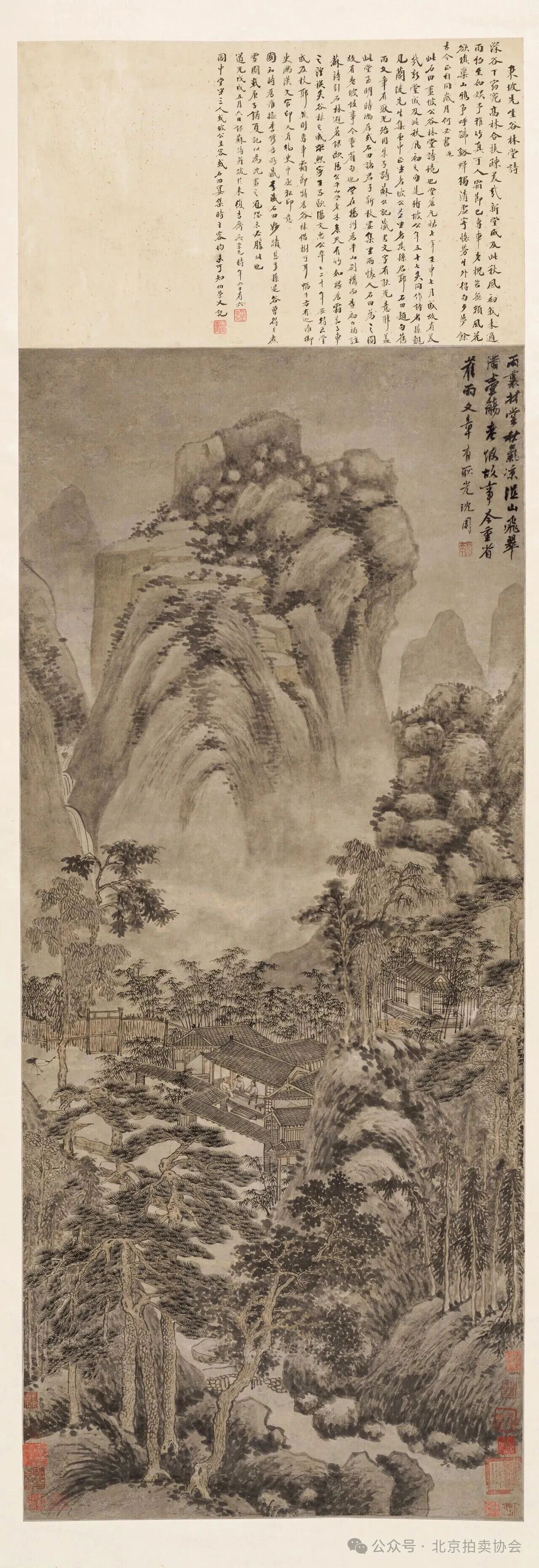 古代夜場有明代沈周的《谷林堂詩意圖軸》,本件作品流傳有序,名家遞藏,并著錄于吳榮光的《辛丑銷夏記》更是尤為難得。知名鑒賞家蕭平先生特別提到,在用筆上,沈周多處采用禿筆,筆觸厚實沉凝,這份力度就連其高徒文征明也難以企及。所以我們看這個山頭是典型的沈周的山頭,中間的這一禿筆在轉折用筆中都相當的有厚度,筆都是厚實的。下半部分的建筑是畫面的核心主體,完全用中鋒畫出建筑的大的格局和它的細部,這也是沈周的一個重要特點。前面的這些松樹和這些用“胡椒點”,墨點的這種樹葉,包括還有石橋尤其是這些石頭的畫法,都具有典型的沈周的印記。